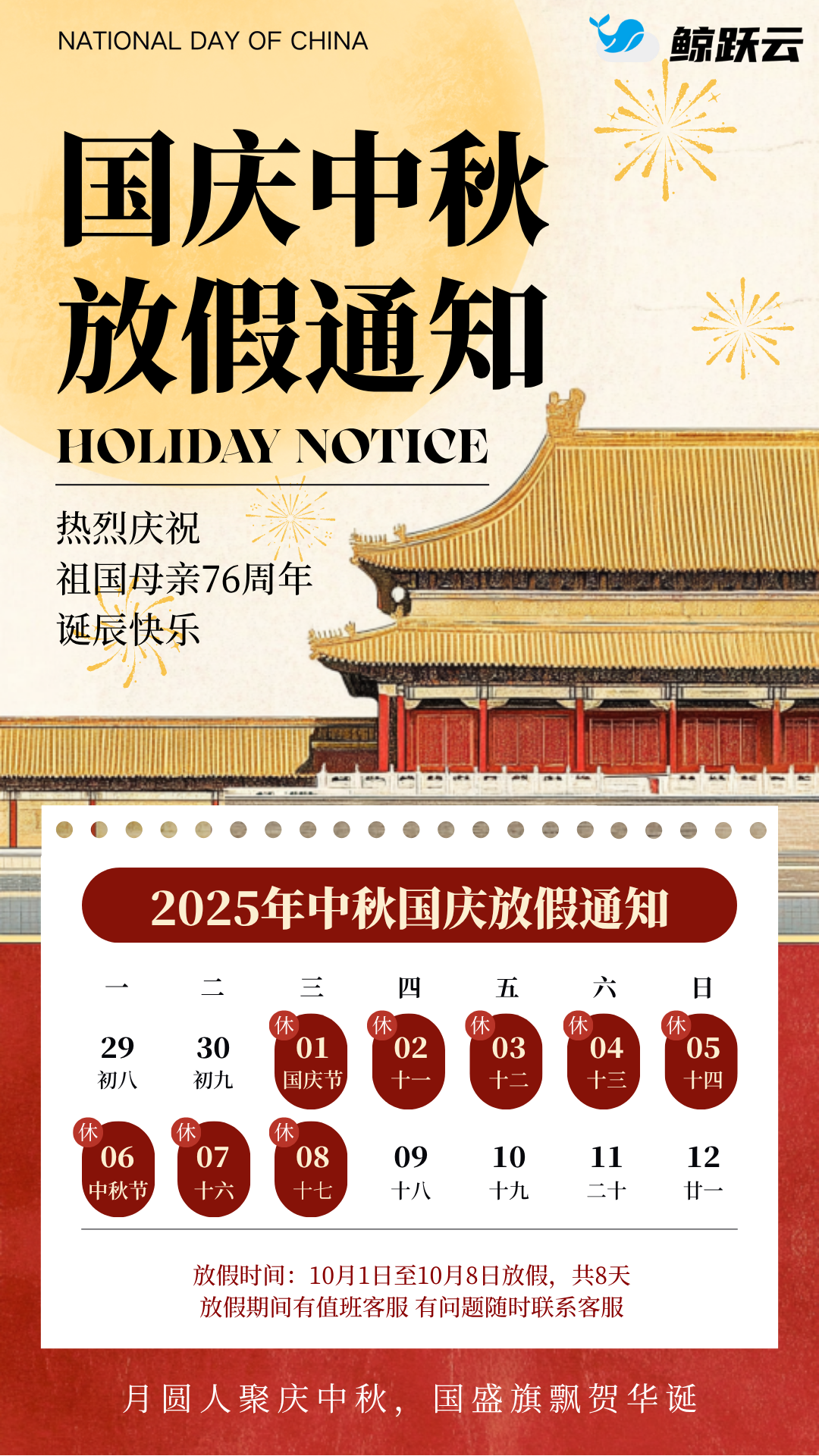 🎉祝您国庆中秋双节假期愉快,阖家幸福,万事顺遂!